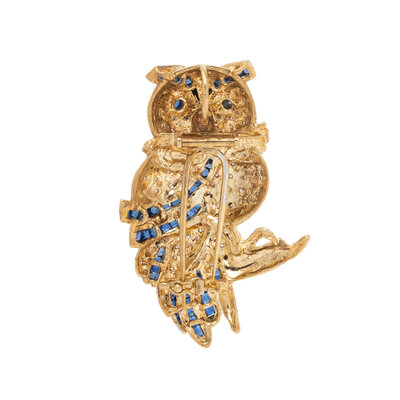 DIAMOND, SAPPHIRE, AND BICOLOR GOLD OWL BROOCH