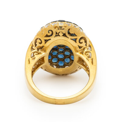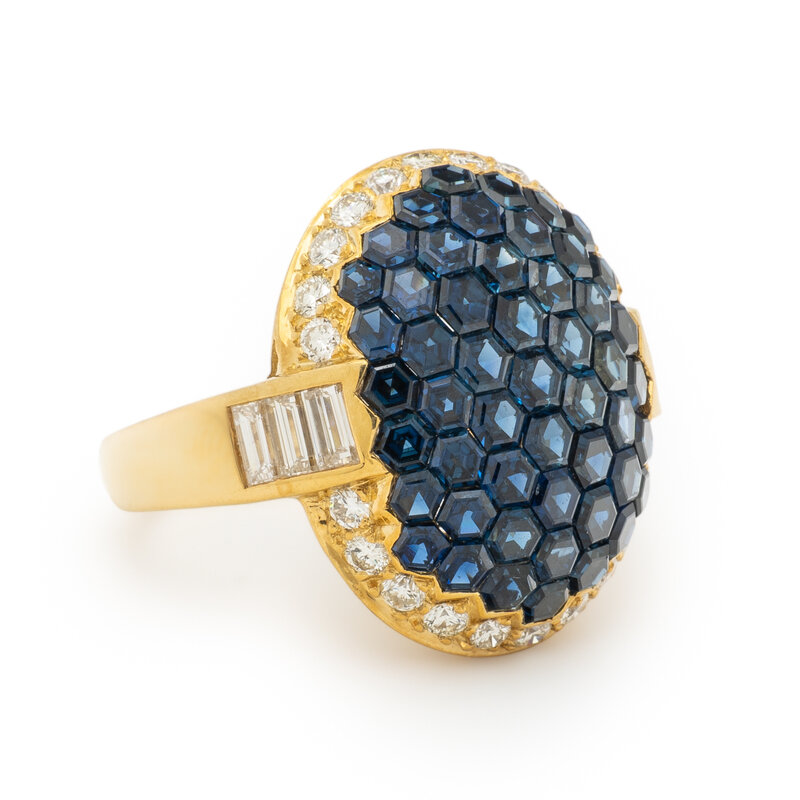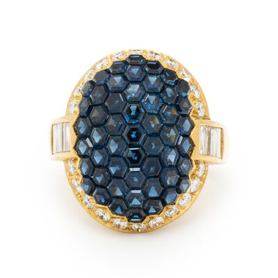Hexagonal sapphires and round and baguette cut diamonds weighing approximately 1.25 carats total. 18 karat yellow gold. Ring size 7 1/2.