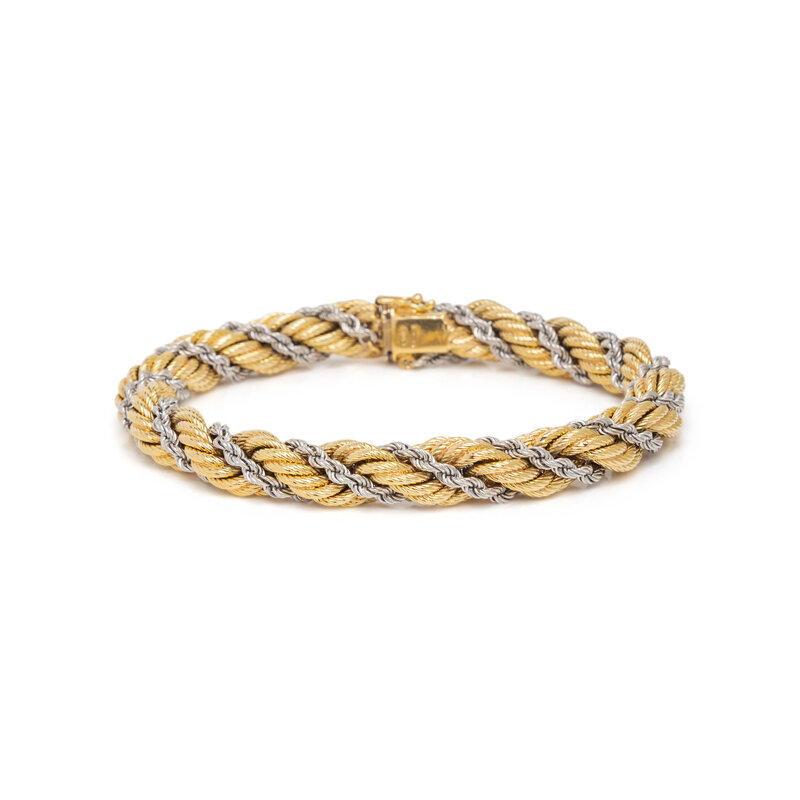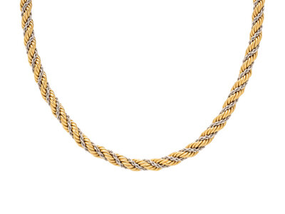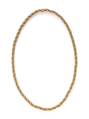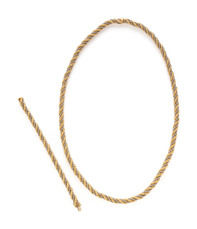 A necklace and a bracelet designed as twisted rope chains, bracelet can be joined to the necklace creating a longer chain. 18 karat yellow and white gold. Necklace: 31 inches long. Bracelet: 6 3/4 inches long.