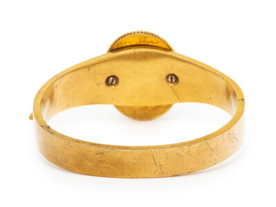 VICTORIAN, YELLOW GOLD, GARNET, DIAMOND, AND ENAMEL BANGLE BRACELET