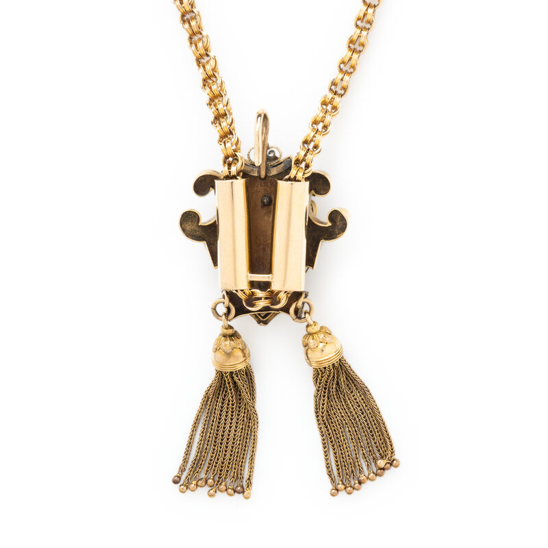 The tassel slide pendant set with seed pearls and black enamel. Yellow gold. 43 3/4 inches long.