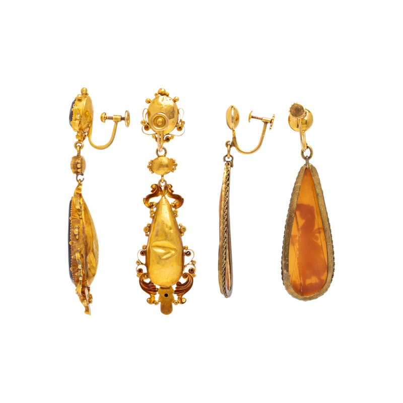 GEORGIAN, CAMEO, AMETHYST, AND LOW KARAT GOLD EARRINGS