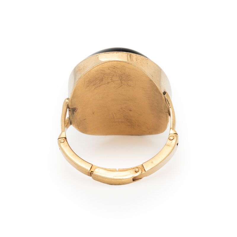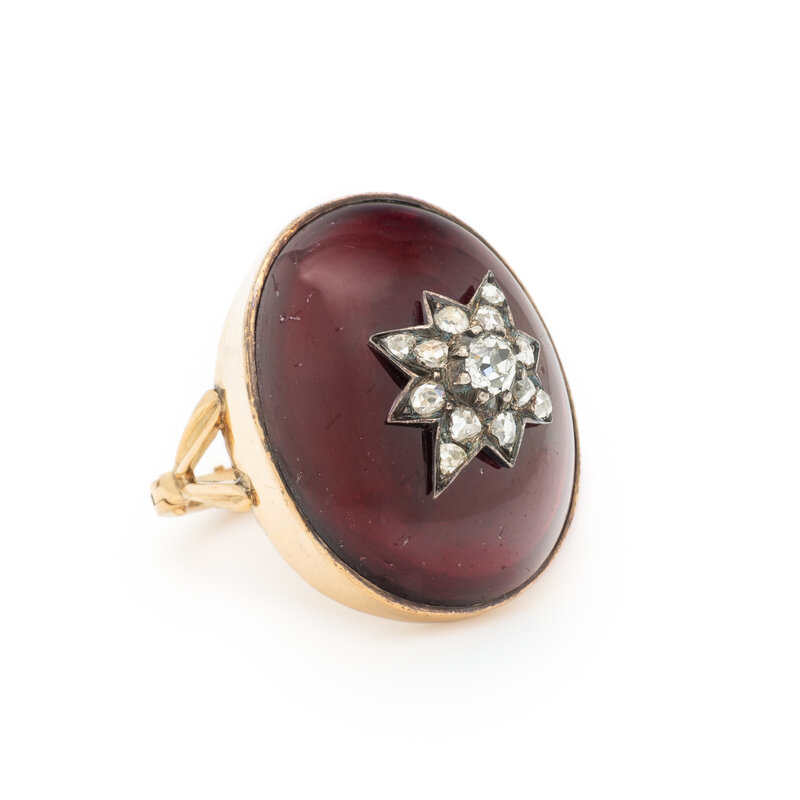 Oval cabochon garnet and old mine and rose cut diamonds. Yellow gold. Ring size 8.