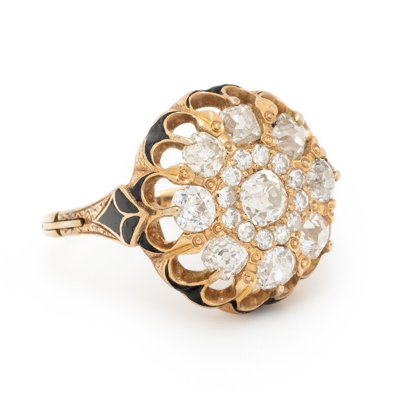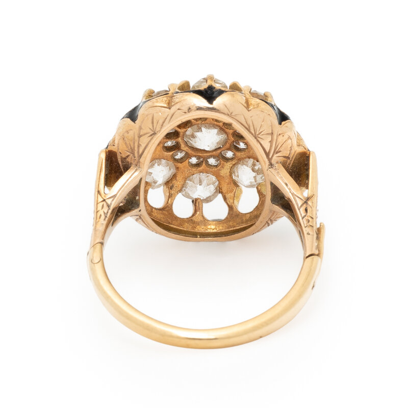 Single and old mine cut diamonds weighing approximately 2.15 carats total. Yellow gold. Ring size 8 1/2.