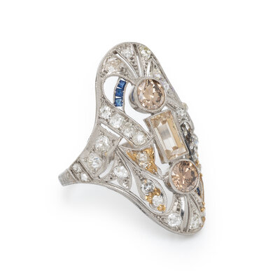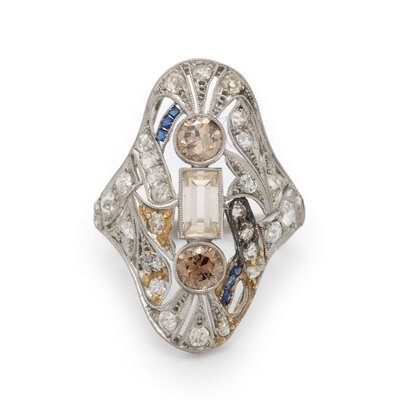 Fancy brown old European and baguette cut diamonds (origin of color not tested) weighing approximately 1.45 carats total, old European cut diamond melee, and calibré-cut synthetic sapphires. Platinum. Ring size 7 1/4.