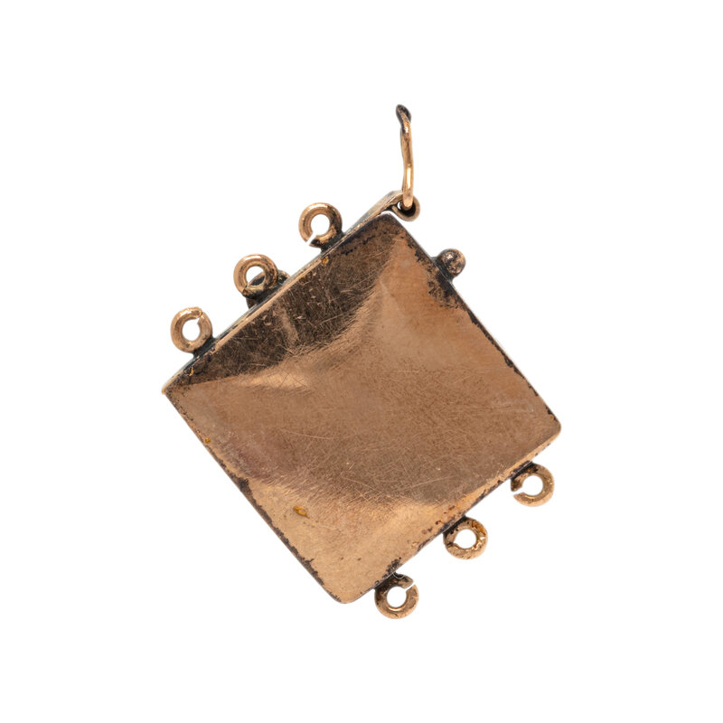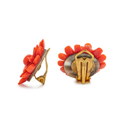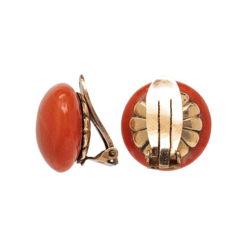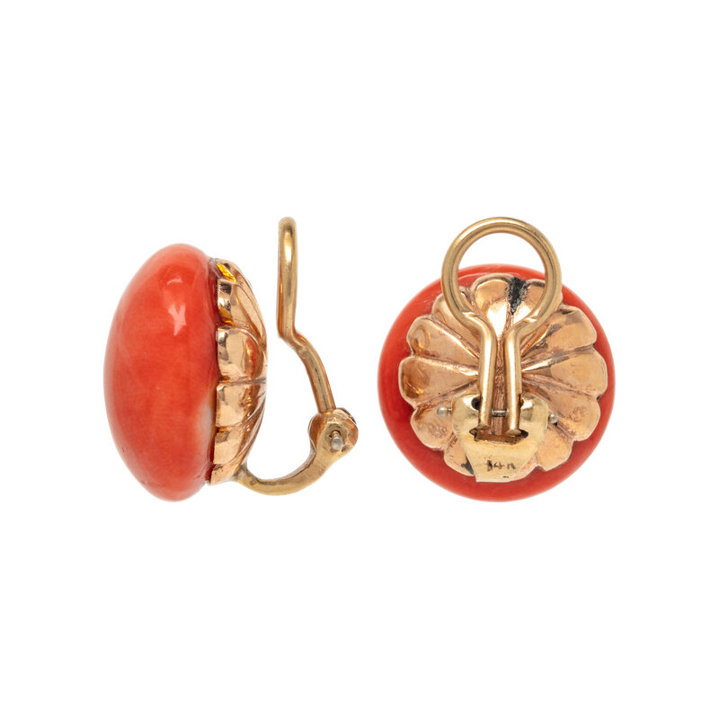 Cabochon coral and carved coral. 14 karat yellow gold and low-karat yellow gold. Earrings: 1/2 inch long. Earrings: 1/2 inch long. Earrings: 1 inch long. Clasp: 3/4 inch long.