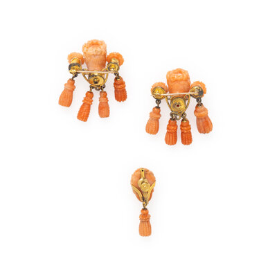 Including two brooches and a single earring. Carved coral. Yellow gold. Brooches: 1 1/2 x 1 inch each. Earring: 1 3/8 inches long.