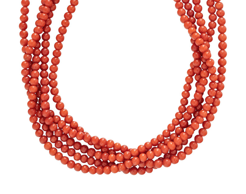 Five strands of coral beads, measuring approximately 4.00 - 4.50 mm. Yellow gold. 15 1/2 inches long.