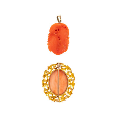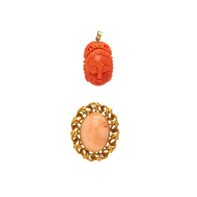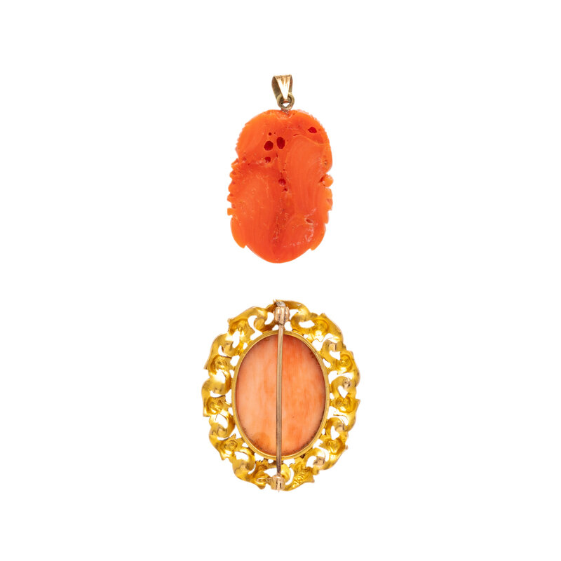 Carved coral. 14 karat yellow gold. Brooch: 1 1/4 x 1 inches. Pendant: 1 1/4 x 5/8 inches. Earrings: 3/4 inch. Earrings: 5/8 inch.