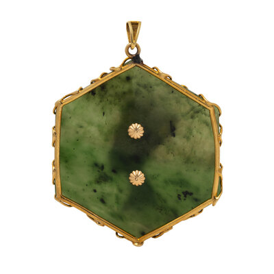 Nephrite jade and round diamonds. Yellow gold. 3 1/4 x 2 3/8 inches.