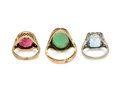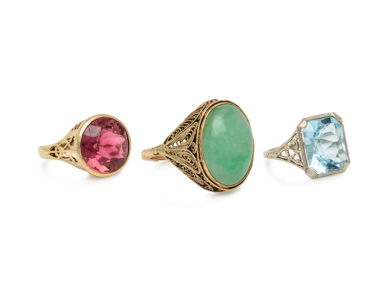 One set with a round pink tourmaline, one set with an oval cabochon jade, and one set with a cut cornered rectangular cut aquamarine. Yellow and white gold. Ring sizes 4, 10, and 5.