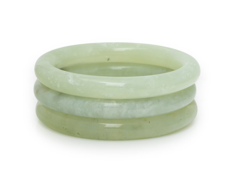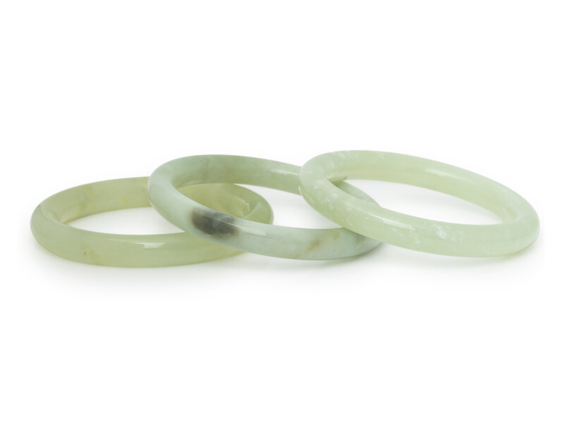 Three bangles total, one jade and two hardstone Each 8 inches inner circumference.