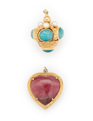 One pendant set with a heart shape cabochon rhodochrosite measuring approximately 24.50 x 24.50 mm, and the other pendant set with oval cabochon amazonite measuring approximately 11.00 x 9.00 mm and cultured pearls measuring approximately 5.00 - 5.25 mm. Yellow gold and 18 karat yellow gold. 1 1/4 x 1 1/8 inches. 1 1/4 x 1 inches.