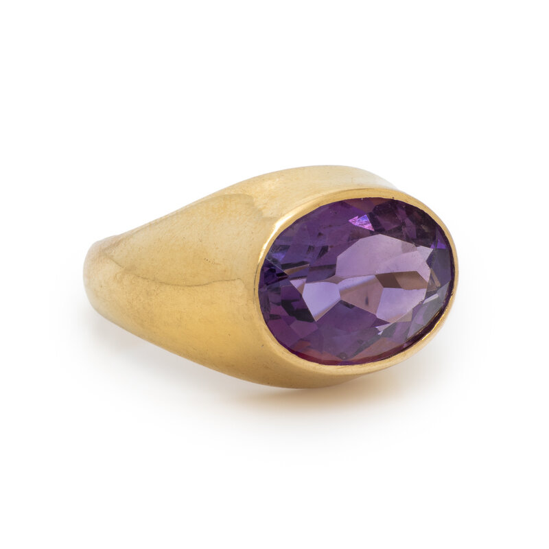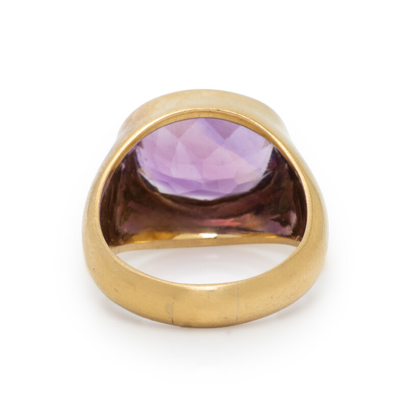 Oval cut amethyst weighing approximately 6.00 carats by formula. 18 karat yellow gold. Ring size 8 1/4.