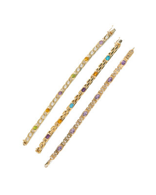 THREE MULTI-GEMSTONE AND YELLOW GOLD BRACELETS