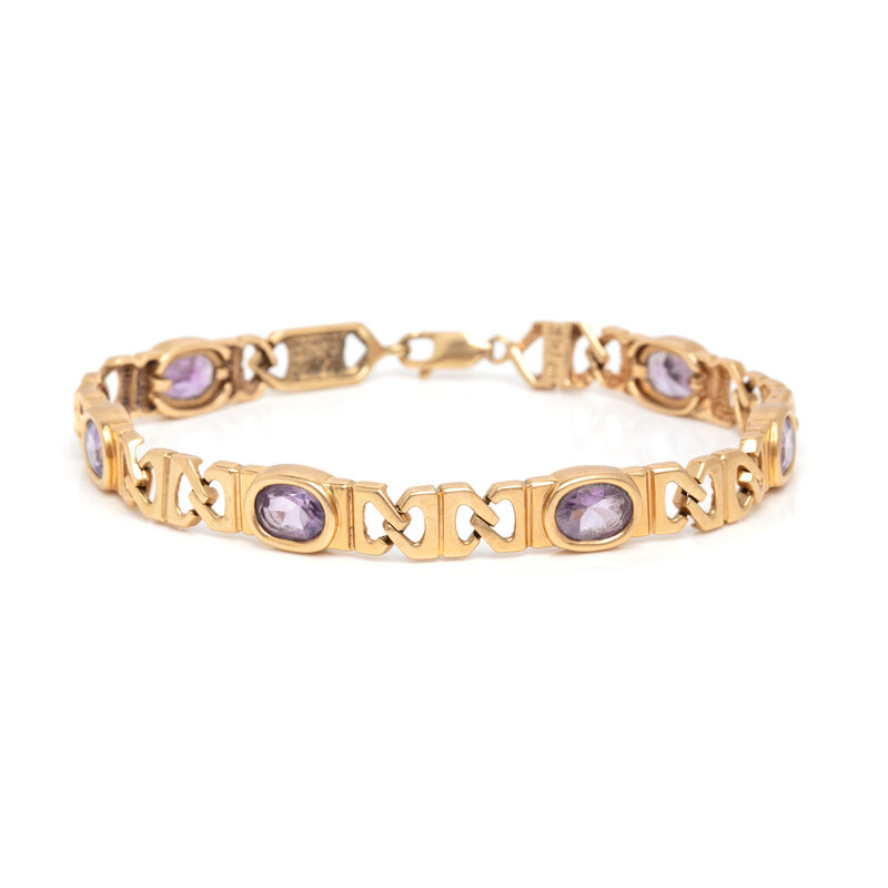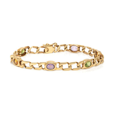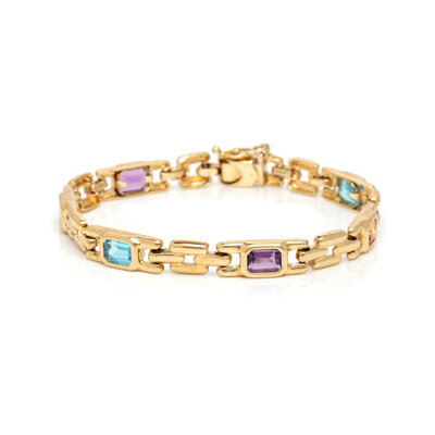 Oval and emerald cut amethyst, emerald cut blue topaz, oval and emerald cut citrine, and oval cut peridot. 14 karat yellow gold. 7 inches long. 6 7/8 inches long. 7 1/8 inches long.