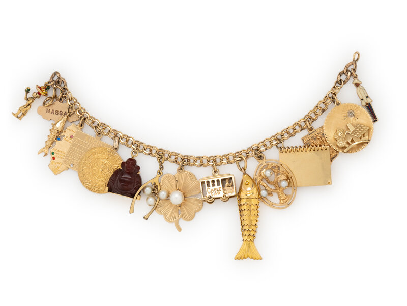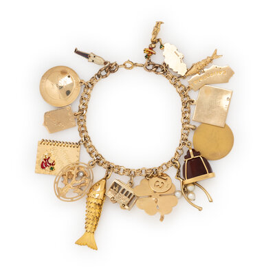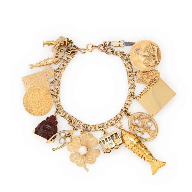 Seventeen charms total. Yellow gold, gold-filled, and low karat gold. 8 inches long.