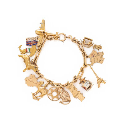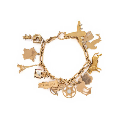 Thirteen charms total. Gold-filled, vermeil, low karat gold, and yellow gold. 8 inches long.