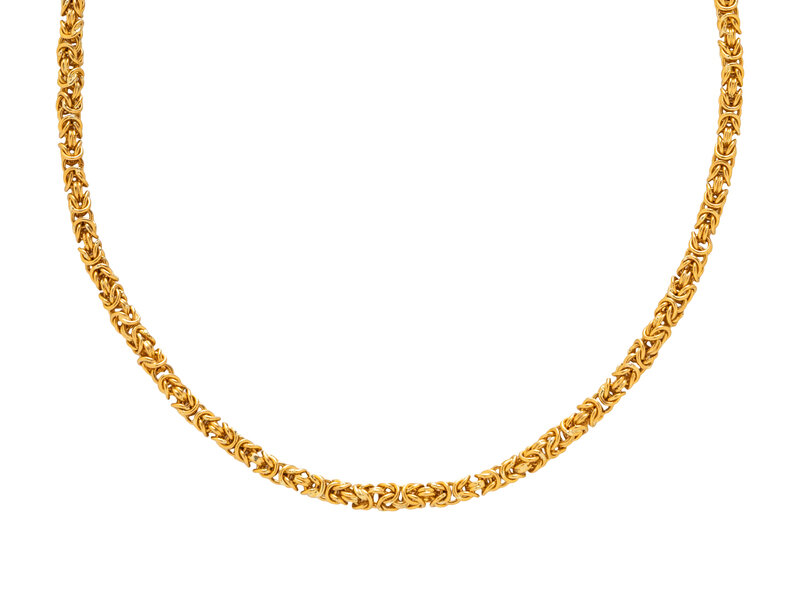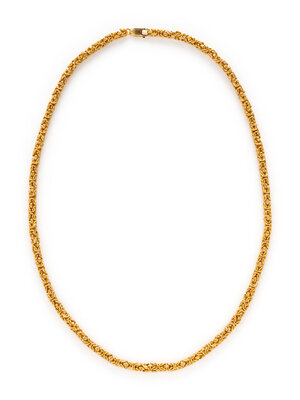 In a byzantine link design. Yellow gold. 26 1/8 inches long.