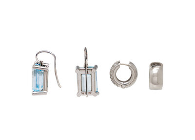 Including a pair of huggie hoops set with round diamonds, and a pair of earrings set with emerald cut blue topaz measuring approximately 13.75 x 9.90 x 6.90 mm each. 1/2 inch long and 7/8 inch long.