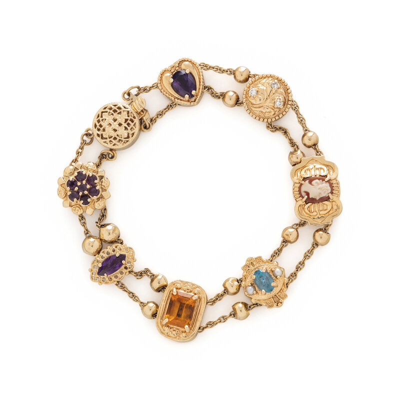 Seven charms variously set with colored stones, seed pearls, and diamonds. 14 karat yellow gold. 7 inches long.