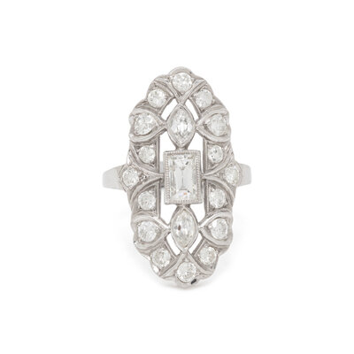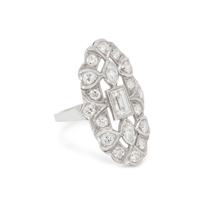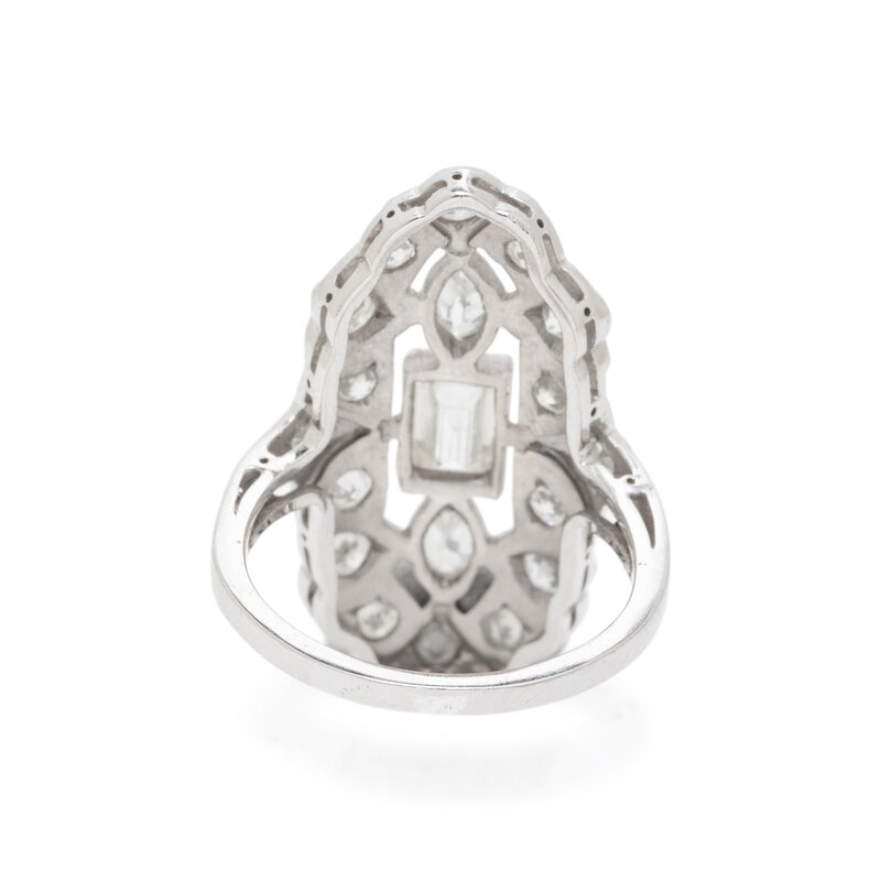 Round, emerald, and marquise cut diamonds weighing approximately 2.25 carats total. Platinum. Ring size 5 1/4.