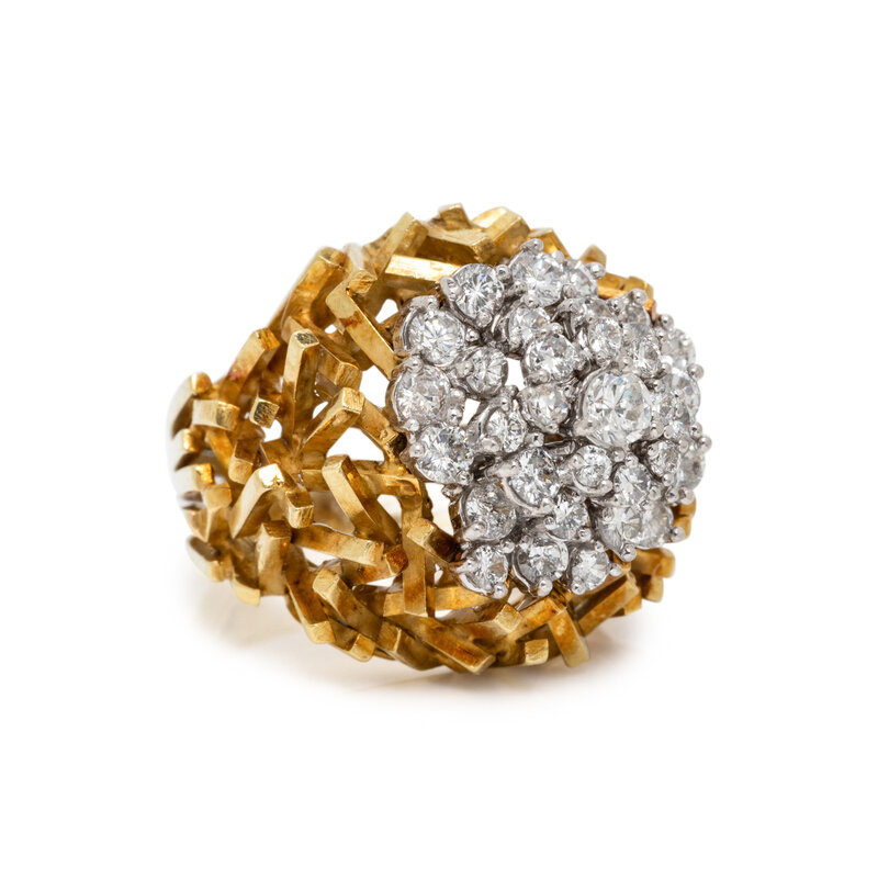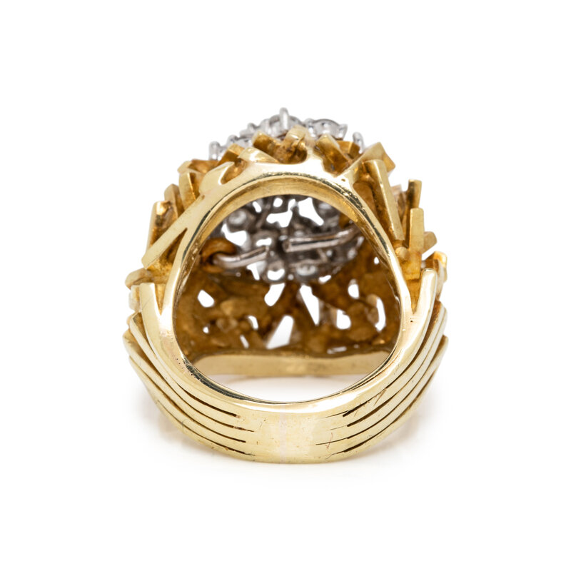 Round and single cut diamonds weighing approximately 1.75 carats total. Yellow gold. Ring size 5.