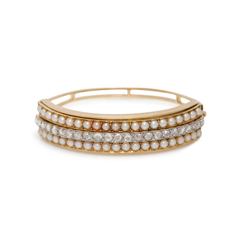Rose cut diamonds and cultured half-pearls, hinged with side clasp. Yellow gold. 6 7/8 inches inner circumference.