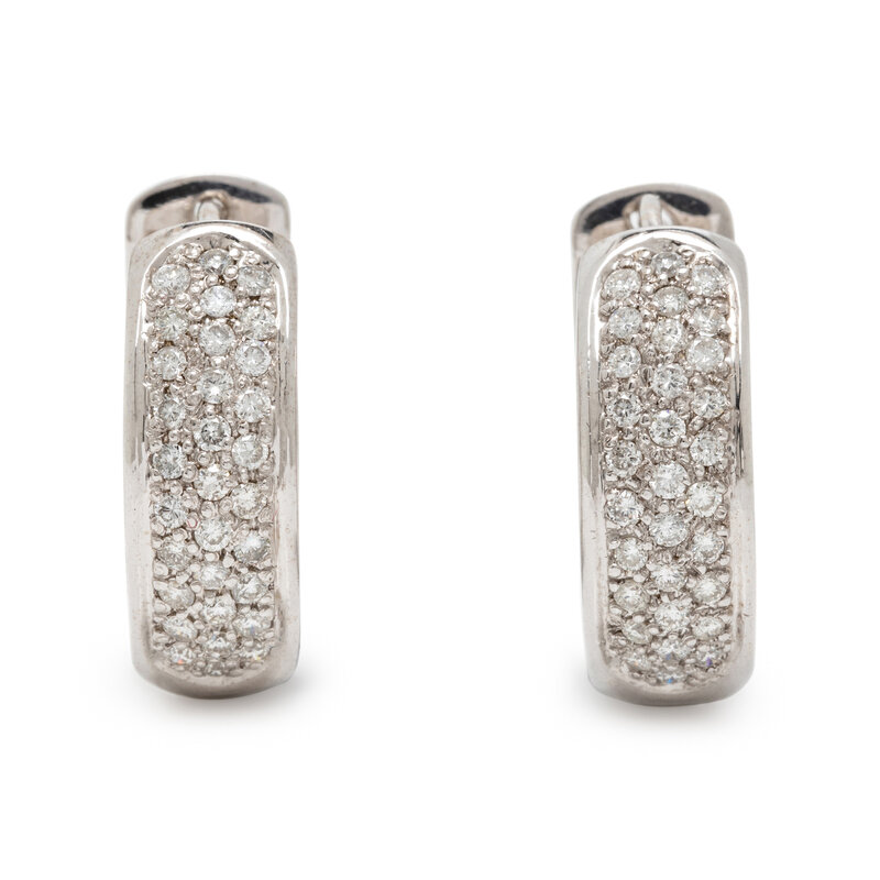 Round diamonds weighing approximately 1.00 carat total. 14 karat white gold. 3/4 inch long.