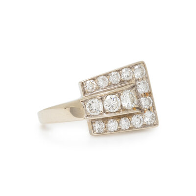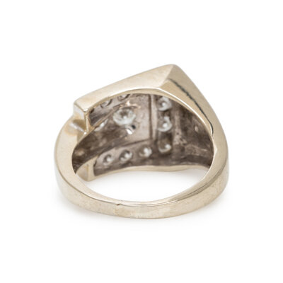 Round diamonds weighing approximately 0.65 carat total. 18 karat white gold. Ring size 4 1/4.