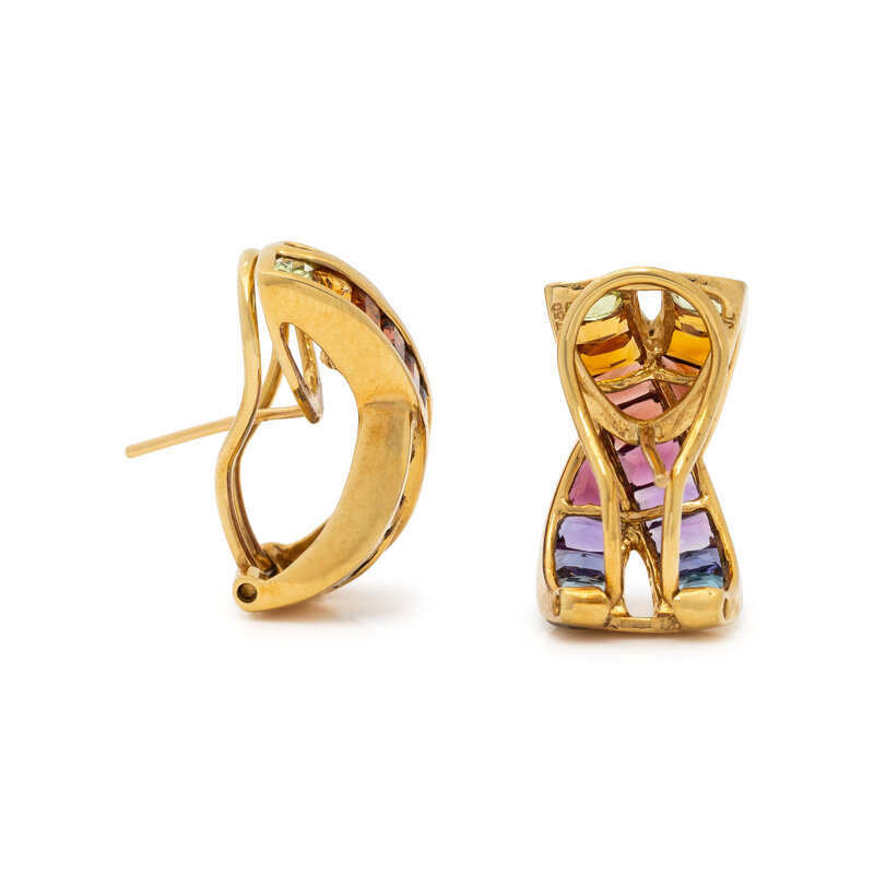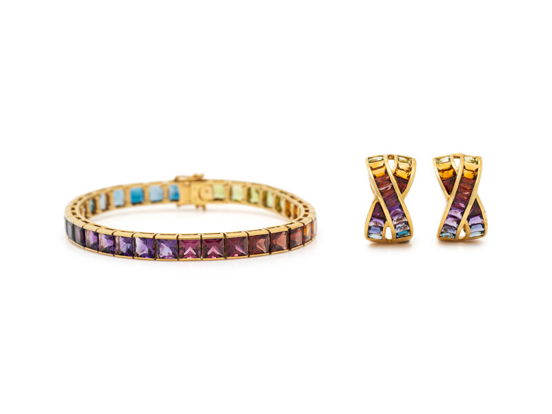 Square and calibre cut blue topaz, amethyst, citrine, peridot, garnet, iolite. 18 karat yellow gold. Bracelet: 7 inches long. Earrings: 7/8 inch long.