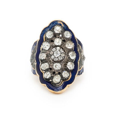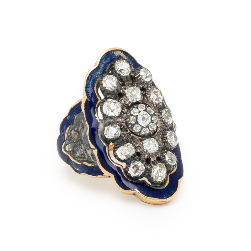 Old European and old mine cut diamonds weighing approximately 2.05 carats total and blue enamel. Yellow gold and silver-topped gold. Ring size 8 1/2.