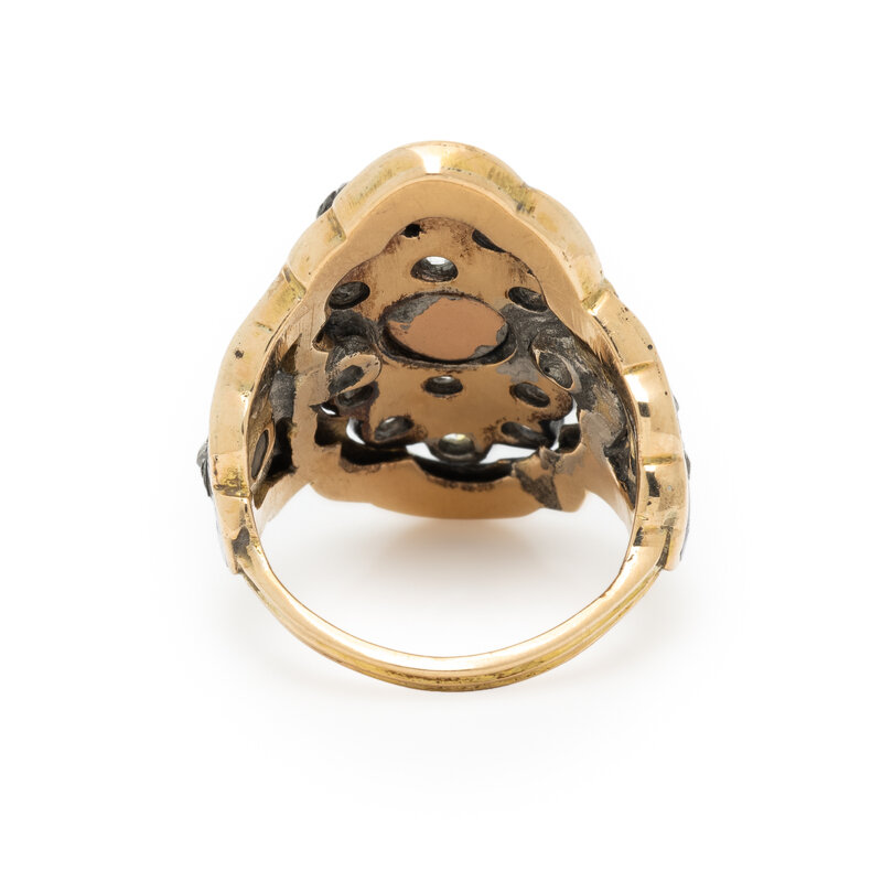 ANTIQUE, DIAMOND, ENAMEL, AND YELLOW GOLD RING