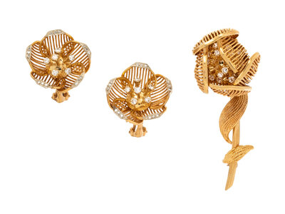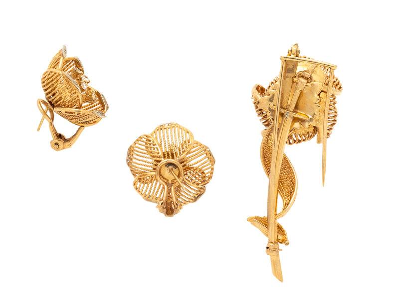 YELLOW GOLD AND DIAMOND FLOWER EARRINGS AND ARTICULATED BROOCH