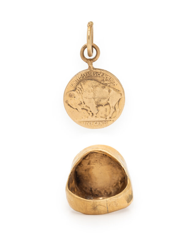 Yellow gold. Believed to be a gold plated buffalo nickel. Ring size 11. Pendant: 1 1/4 x 3/4 inches.