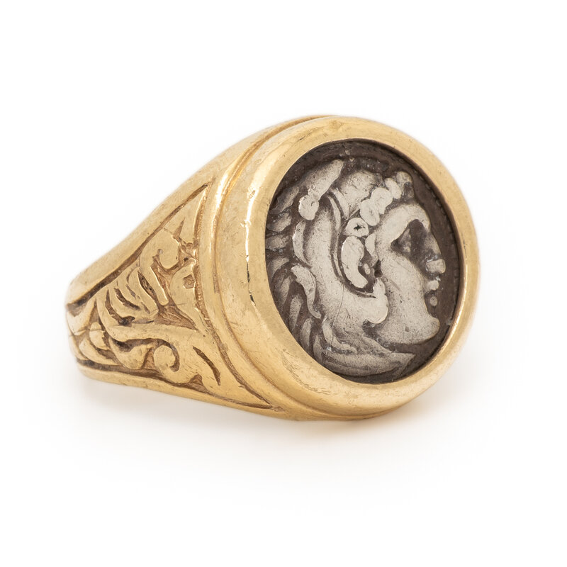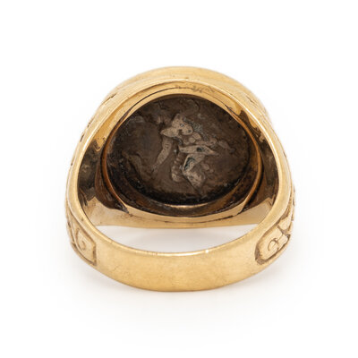 Greek silver drachma coin. 14 karat yellow gold. Ring size 10 1/4.