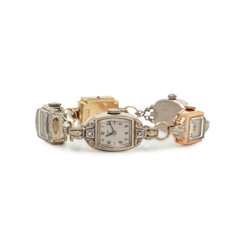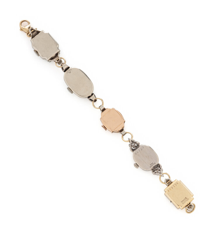 Five watches total, variously set with single cut diamonds. Yellow and white gold. 7 inches long.