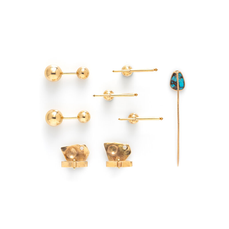 Includes a pair of cufflinks, a dress set comprised of a pair of cufflinks and three shirt studs, and a turquoise stick pin. 14 karat yellow gold. Cufflinks: 1 5/8 x 5/8 inches. Cufflinks: 3/8 x 3/8 inch. Shirt studs: 1/4 x 1/4 inch. Stick pin: 2 5/8 inches long.