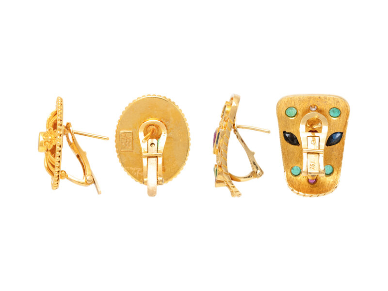 Round, oval, and pear shape rubies, round emeralds, round diamonds, and marquise cut sapphires. 22 and 18 karat yellow gold. 3/4 inch long. 7/8 inch long.