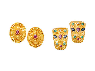 TWO PAIRS OF YELLOW GOLD AND MULTIGEM EARRINGS