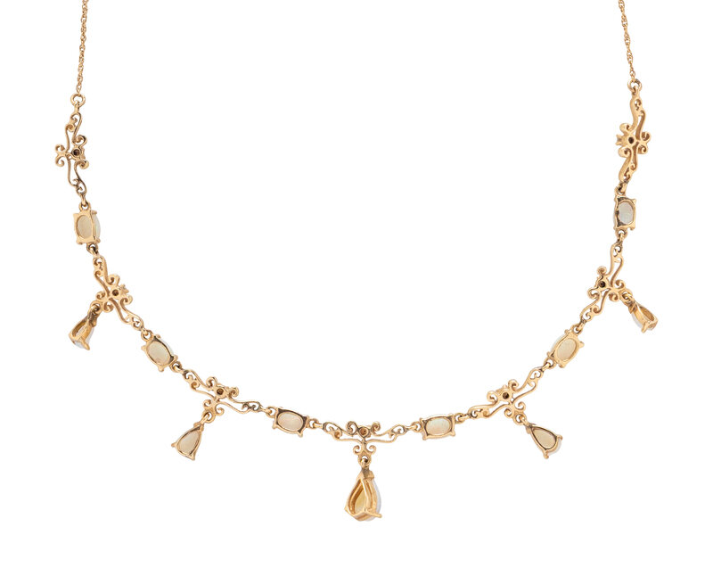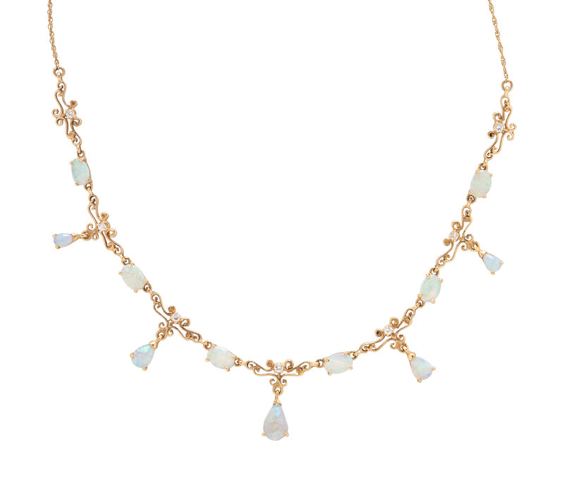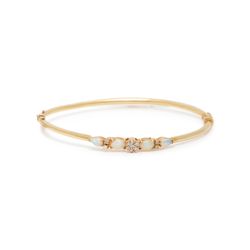 Oval and pear shape cabochon opal, round diamonds, the bangle hinged with aside clasp. 14 karat yellow gold. Necklace: 16 5/8 inches long. Bracelet: 6 1/2 inches inner circumference.