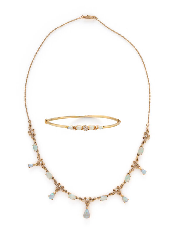 OPAL, DIAMOND, AND YELLOW GOLD NECKLACE AND BANGLE BRACELET