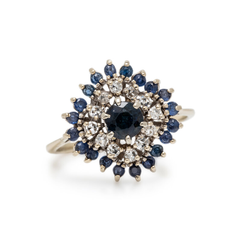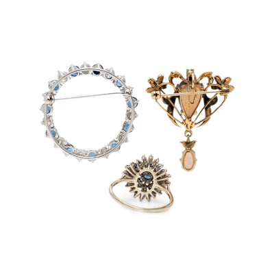 Including a circle brooch set with round sapphires and round diamonds weighing approximately 1.90 carats total, a brooch pendant set with pear and round cabochon opals and round diamonds, and a ring set with round sapphires and single cut diamonds. Platinum and yellow gold. Circle brooch: 1 1/8 x 1 1/8 inches. Opal brooch: 1 1/4 x 1 inches. Ring size 8.
