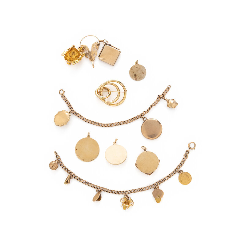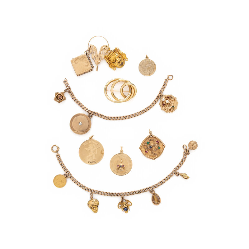 Including two charm bracelets, a brooch, and seven loose charms. Yellow gold, gold-filled, and low karat gold. Bracelets: 6 1/2 and 8 inches long. Brooch: 1 1/2 x 1 3/16 inches. Charms: 3/4 - 1 1/2 inches long.