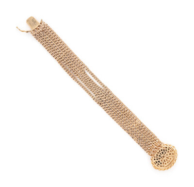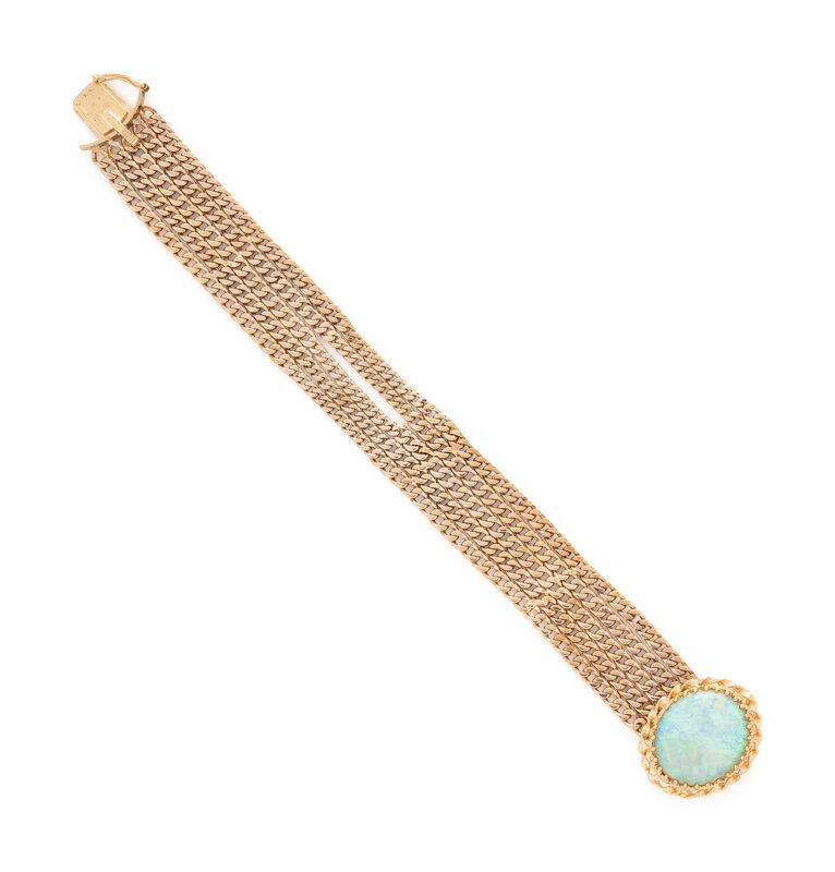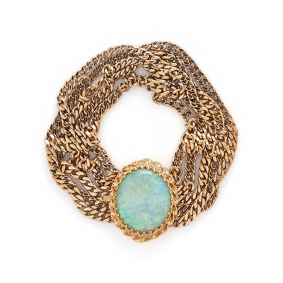 Oval cabochon opal measuring approximately 19.25 x 16.70 mm. Yellow gold. 7 1/4 inches long.