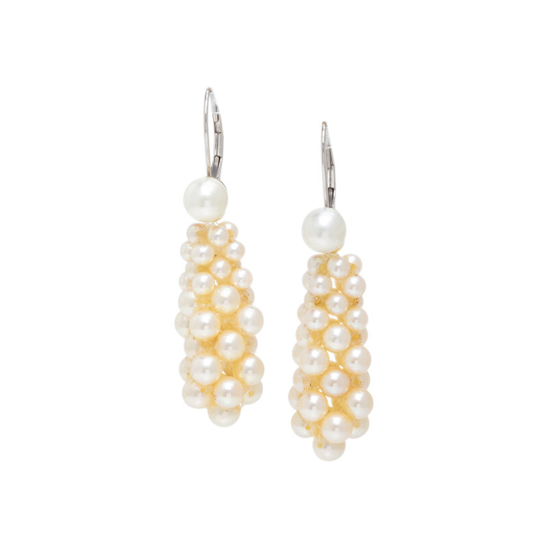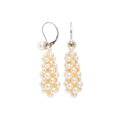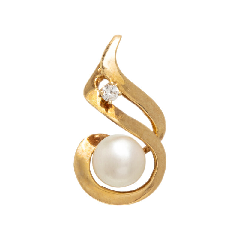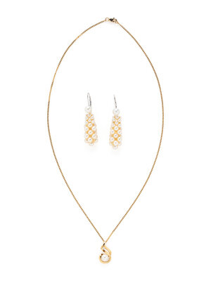 Cultured pearls and round diamond. 14 karat white and yellow gold. Earrings: 1 7/8 inches long. Pendant: 3/4 inch long. Chain: 18 1/2 inches long.