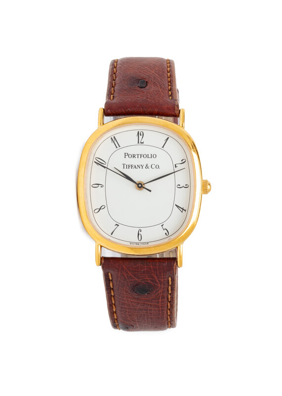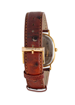 Stamps: Case: PORTFOLIO TM BY TIFFANY & CO. STAINLESS STEEL BACK BASE METAL BEZEL GOLD ELECTROPLATED 10M ME SWISS MADE WATER RESISTANT. Strap: TIFFANY & CO. Genuine Ostrich 18S. Clasp: TIFFANY & CO.