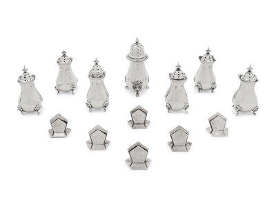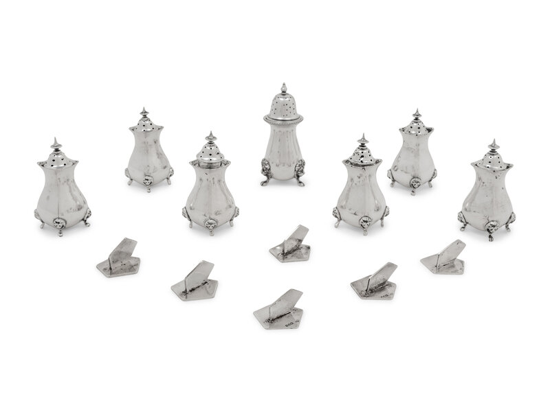 comprising a set of six casters and a set of six place-card holders, together with a similarly decorated American silver caster; 13 items total