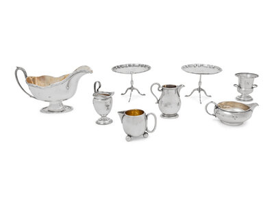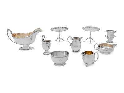comprising a salt cellar marked for Lionel Alfred Crichton, London, 1911; a sauce boat marked for William Hutton and Sons, Sheffield, 1911; a pair of miniature tea tables marked for Roberts and Belk, Sheffield, 1912; a creamer marked for Lionel Alfred Crichton, London; a creamer marked for Thomas Slater, William Slater and Henry Holland, London, 1897; a creamer marked for Charles Boyton, London, 1884; a creamer marked for London, 1936; eight items total.