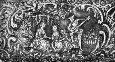 each side cast in relief with a courtly scene framed by rocailles.